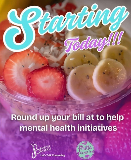 When you check out at Frutta Bowls Hunter’s Creek, simply round up your total — and that small change will make a big impact by helping Broken Wings Ministry provide free or low-cost mental health care to those who need it most.